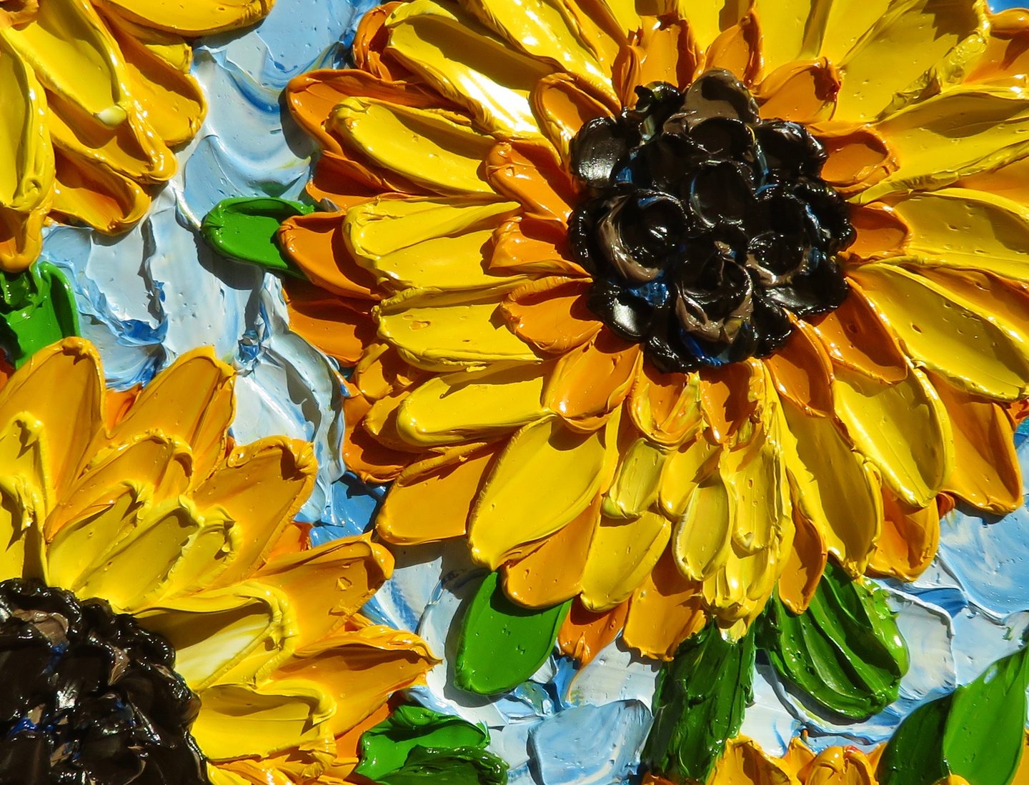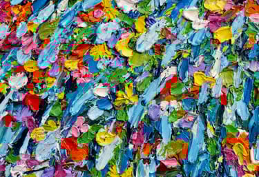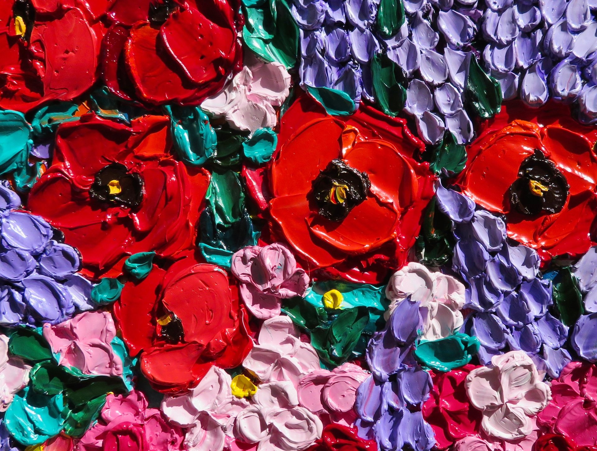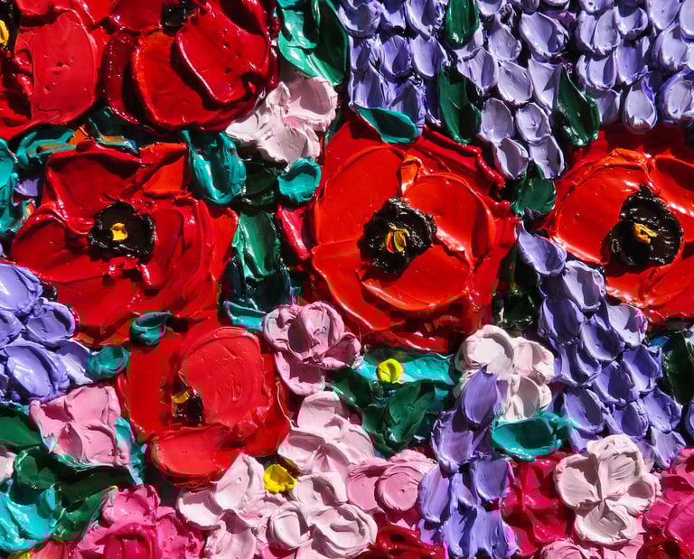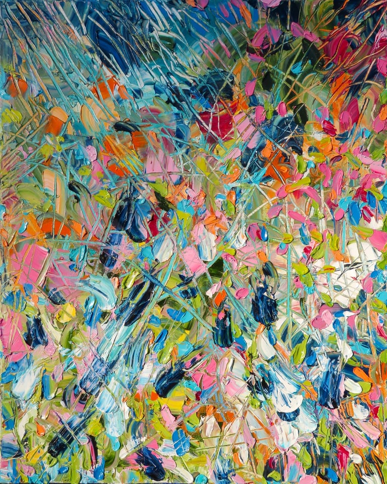 Paint is pushed, lifted, and carved with a palette knife, building dense layers that catch light and cast shadow.