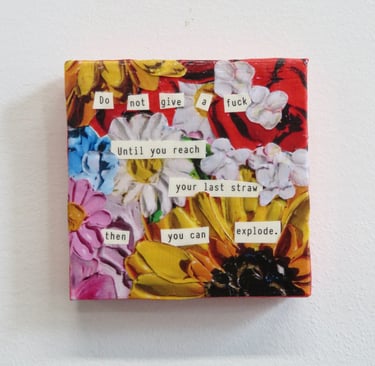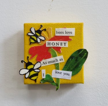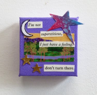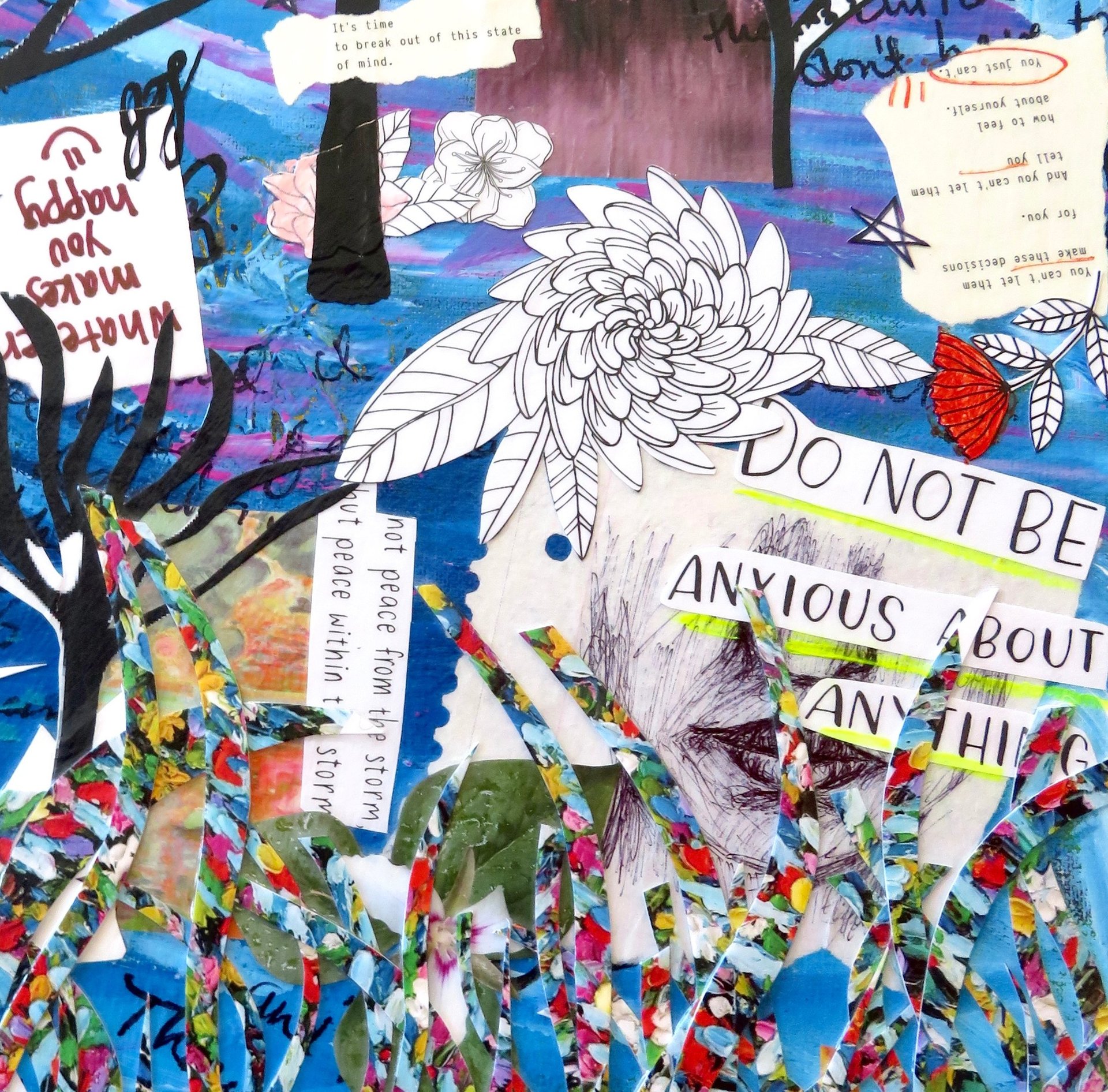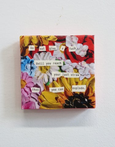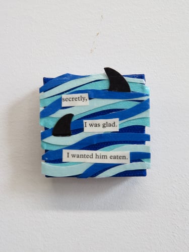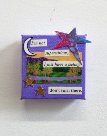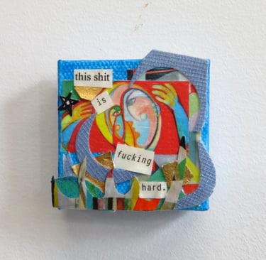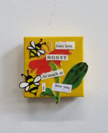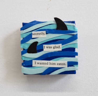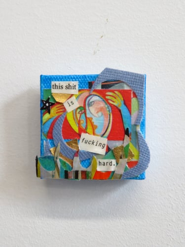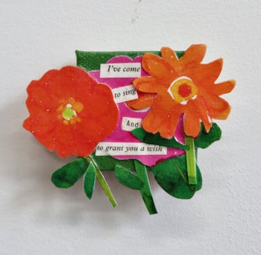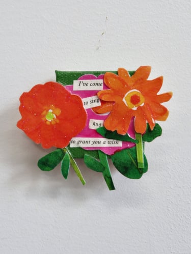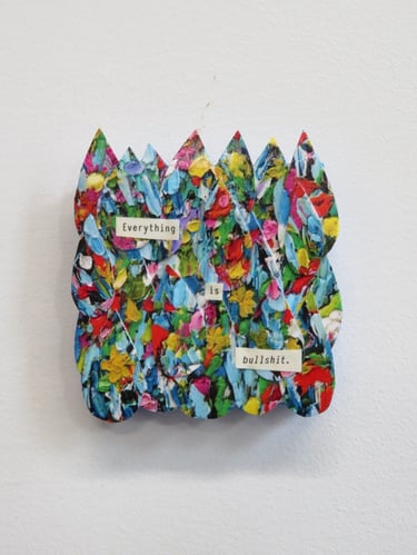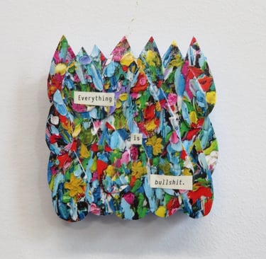 Fragments of language held in paper, paint, and glue.